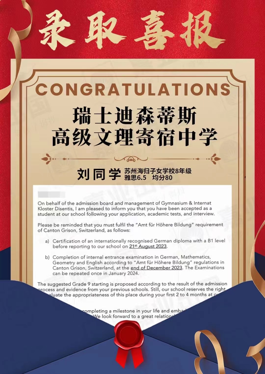 瑞士迪森蒂斯高級紋理寄宿中學Offer